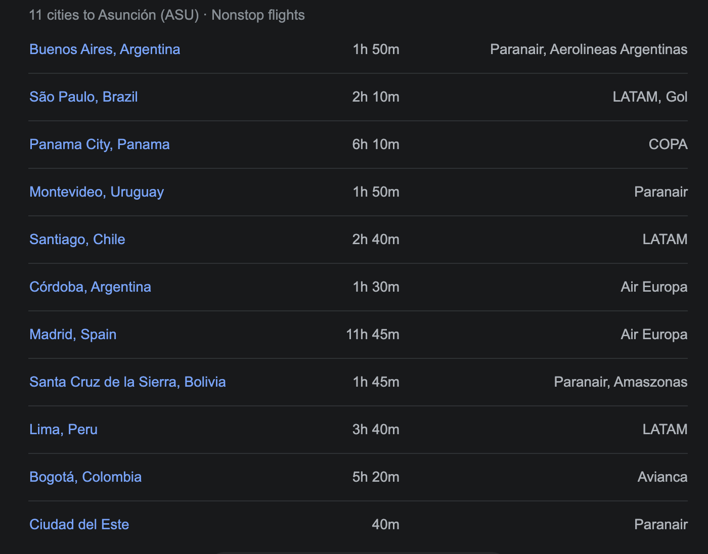 There are only 11 cities in the world that have direct flights to Asuncion.