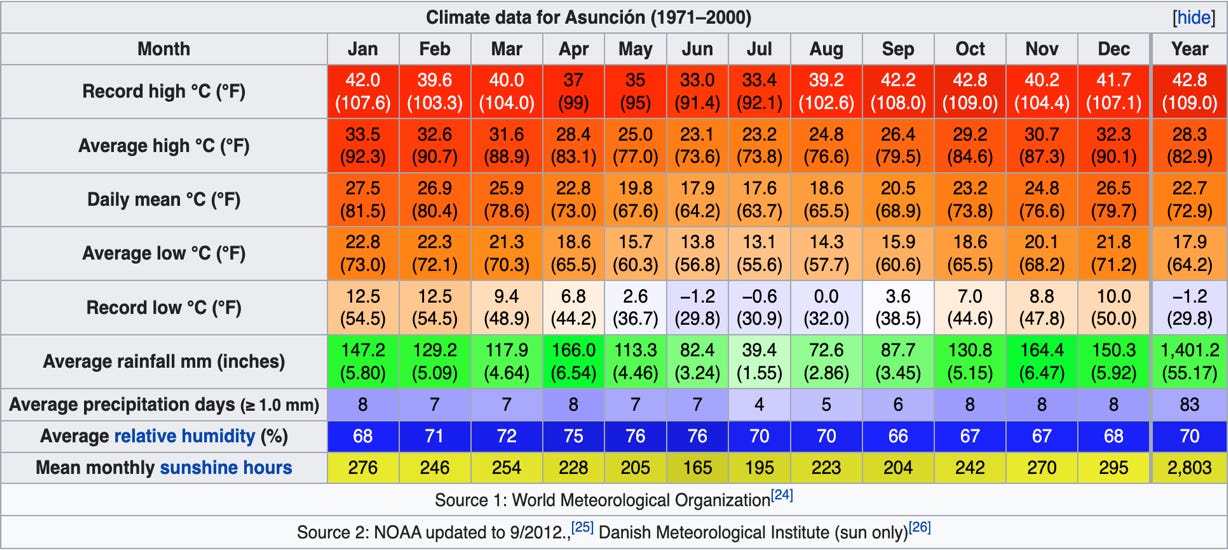 Expect a temperature range of about 65-90°F. Asuncion doesn’t have a rainy season – it rains periodically throughout the year – so no need to worry about that.