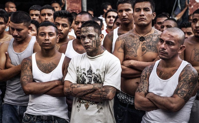 We turn around to see a group of 5 Salvadorian teenagers walking towards us, their hands are behind their backs, and they’re not really being aggressive. Tattoos dotting their skin.