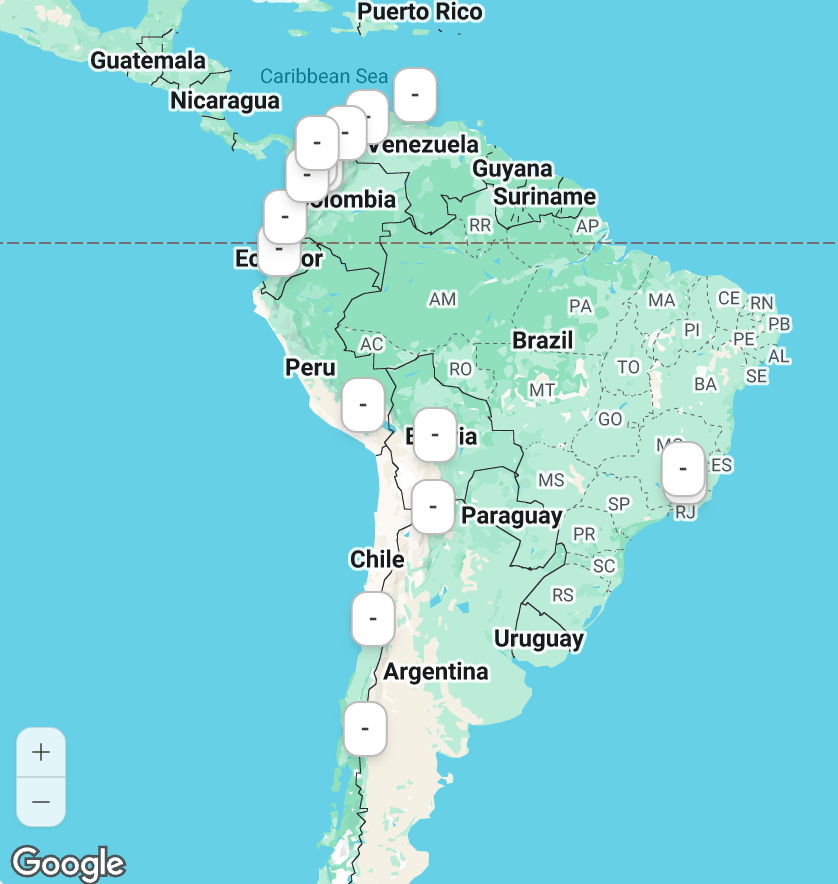 27 mountain cities across 13 countries, organized by region â South America, Central America, and Mexico.