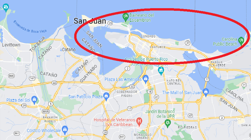 This means a narrow strip of land stretching from the famous Old San Juan down to Carolina in the east:
